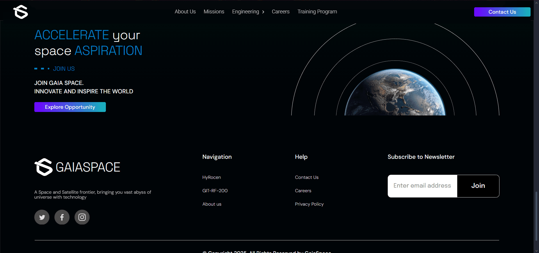 A multi-page space-tech website designed and developed to present GaiaSpace’s satellite programs, missions, and research initiatives through a structured, futuristic, and scalable digital experience.